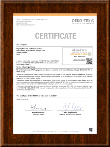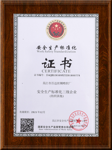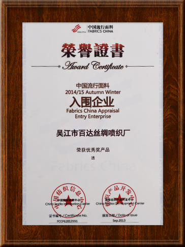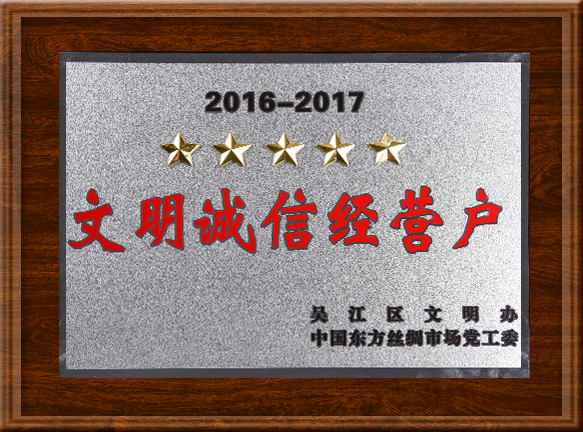 公司先后被评为:“工人先锋号”、“文明经营户”、“中国流行面料入围企业”、“中国盛泽丝绸化纤指数-指定采样点”、“2011年转型升级先进企业”、“江苏省企业信用管理贯标证书”、“企业信用等级证书AAA级”、“2014-2015年AAAAA级文明诚信经营户”称号